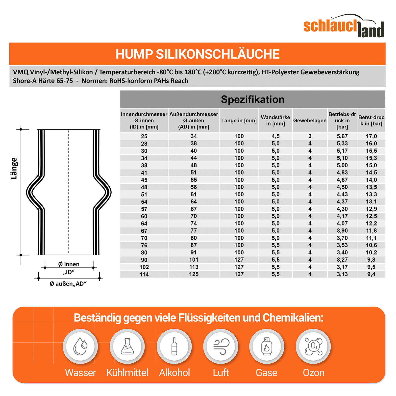 Silikon-Schlauch HUMP in PREMIUM-QUALITÄT mit mehreren Lagen Gewebeverstärkung aus ultrastarkem, doppelt vernetztem HT-Polyester. Verringert Schwingungen & Spannungen in Luft- und Kühlwassersystemen - für Winkel bis 10° Grad. Vergütete & glänzende Oberflächen - widerstandsfähig, flexibel & langlebig. Beständig in vielen Flüssigkeiten & Chemikalien – Wasser, Kühlmittel, Alkohole, Luft, Gase, Ozon etc… Dauerhaft stabil bis 180°C. Hochleistungs-Schläuche für Luft-, Kühl- und Unterdrucksysteme. Top Wahl für Profis, Kfz, Maschinenbau, Heimwerker, Landwirtschaft, Traktoren, Boote, Schiffe, Flugzeuge und Industrieanlagen