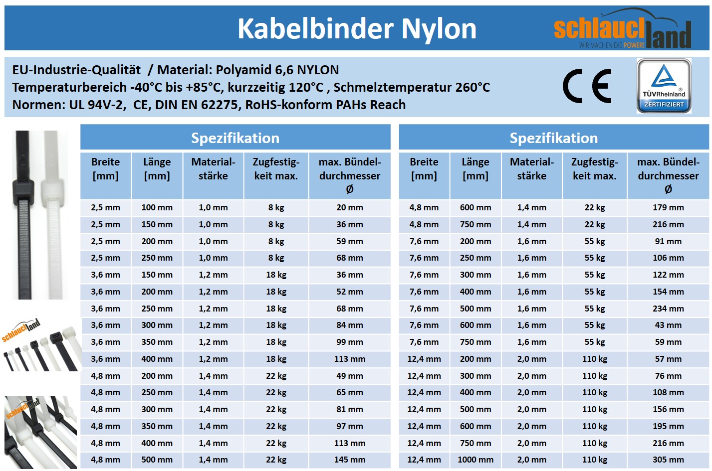 NYLON KABELBINDER IN TOP QUALITÄT (Polyamid 6,6) & Schlauchbinder zur Befestigung, Fixierung & Montage im Innen- und Außenbereich. Leichtes Anbringen, ausgezeichnete Haltbarkeit, rostfrei und UV- und Wetter-beständig. Sicherer Halt durch den innenliegenden Rasten-Verschluss. Hohe Reißfestigkeit. Dauerhaft beständig bis 120°C. Oberflächen glatt und gratfrei. Konform mit allen europäischen Normen. EU Premium Industriequalität
