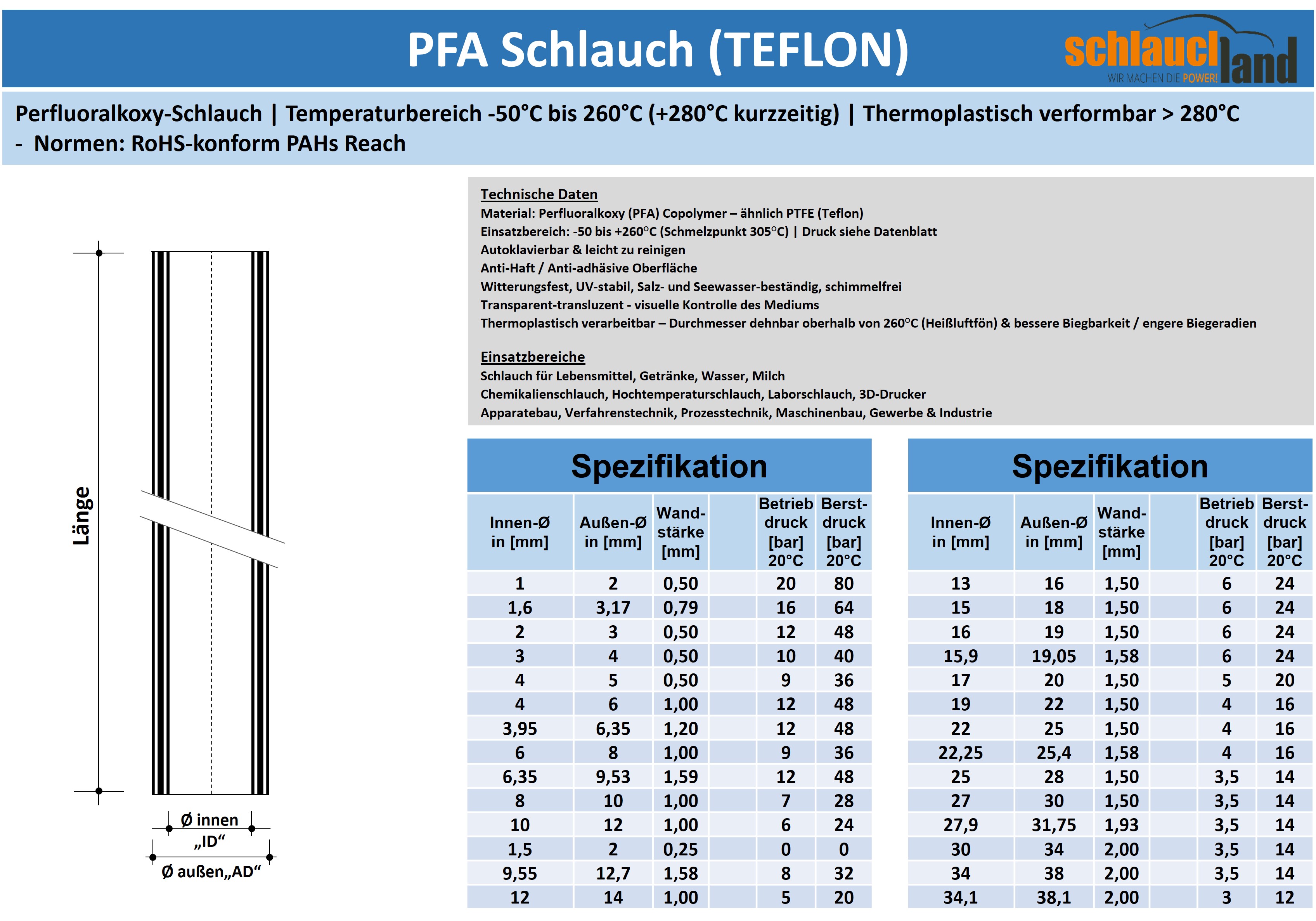 PFA-SCHLAUCH transparent in TOP QUALITÄT aus lebensmittelechtem PFA – Perfluoralkoxy (ähnlich PTFE / TEFLON) in TOP-Qualität für z.B. Labor, Gase, Wasserstoff, Lösungsmittel, Alkohole, …, Trinkwasser, Wein, Säfte, Bier, Milch. Zertifiziert nach FDA 21CFR 177.2600 - amerikanische und europäische Normen. 100% frei von Schadstoffen & Weichmachern, Geschmacks- & Geruchs-neutral. Sehr robust, biegsam & langlebig. PFA ist Weiterentwicklung des Kunststoffs PTFE – erhöhte Betriebstemperatur, chemisch beständig gegen Chemikalien und stabil bis 260°C – autoklavierbar. Transluzent-durchscheinend – gute visuelle Kontrolle der Sauberkeit und des Medien-Durchflusses. Porenfrei - geringe Diffusion. Hergestellt aus hochreinen kristallinen Granulaten führender Hersteller wie DuPont, Dyneon und Daikin. Erste Wahl für Profis, Kfz, Maschinenbau, Heimwerker, Landwirtschaft, Marine, Flugzeuge und Industrieanlagen.