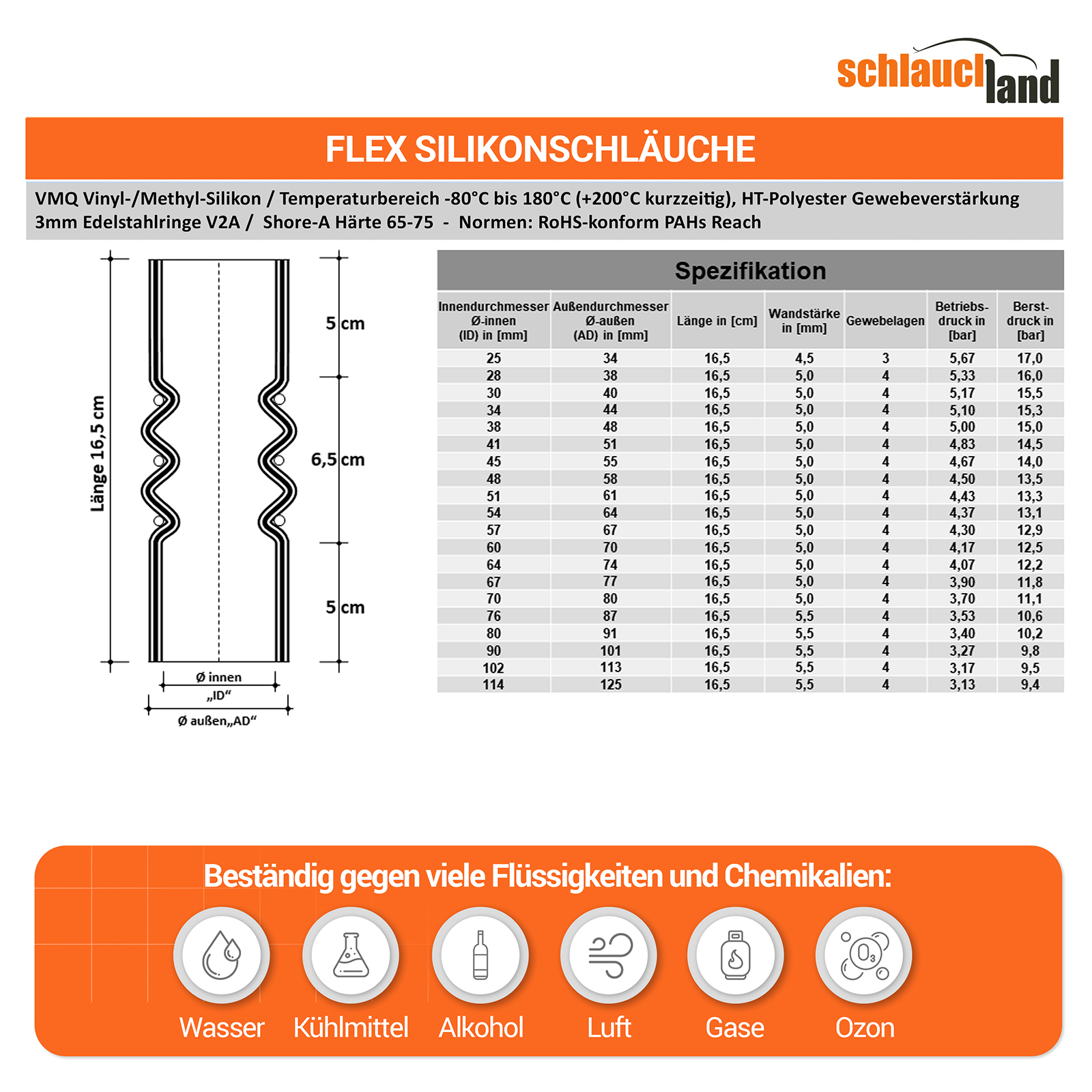 FLEX Silikonschlauch in PREMIUM-QUALITÄT verringert Schwingungen & Spannungen in Luft- und Kühlwassersystemen - für Winkel bis 20° Grad. Mit mehreren Lagen Gewebeverstärkung aus ultrastarkem, doppelt vernetztem HT-Polyester. Vergütete & glänzende Oberflächen - widerstandsfähig, flexibel & langlebig. Beständig in vielen Flüssigkeiten & Chemikalien – Wasser, Kühlmittel, Alkohole, Luft, Gase, Ozon etc… Dauerhaft stabil bis 180°C. Hochleistungs-Schläuche für Luft-, Kühl- und Unterdrucksysteme. Top Wahl für Profis, Kfz, Maschinenbau, Heimwerker, Landwirtschaft, Traktoren, Boote, Schiffe, Flugzeuge und Industrieanlagen